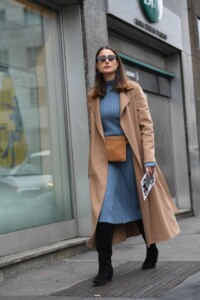 In jurul taliei, peste palton : tinuta este aproape monocroma, ceea ce face ca borseta sa iasa in evidenta.